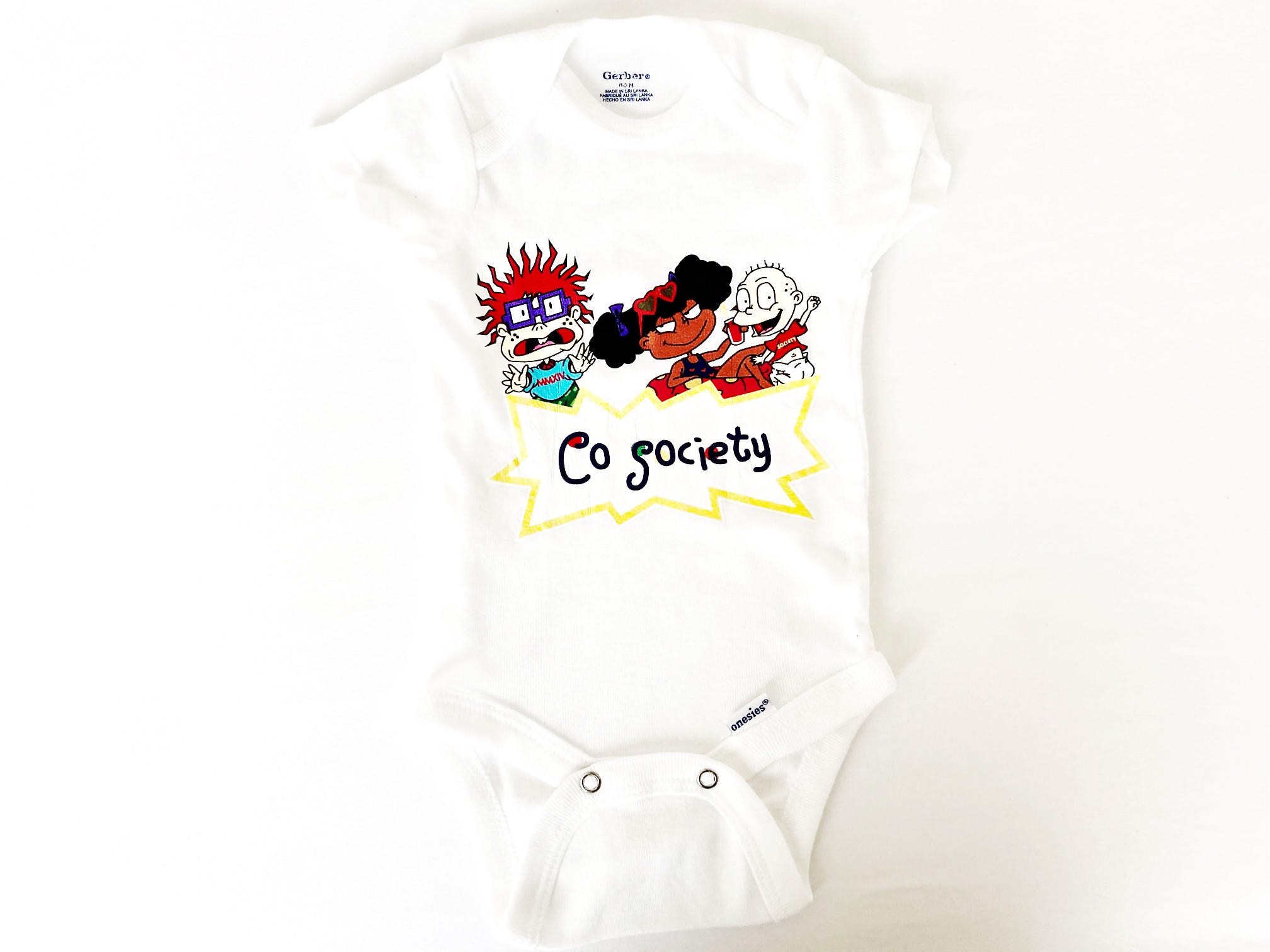 Our Cold Society Rugrat Baby Onesie expands to fit easily over the head. The three snap leg closure allows for easy changes.