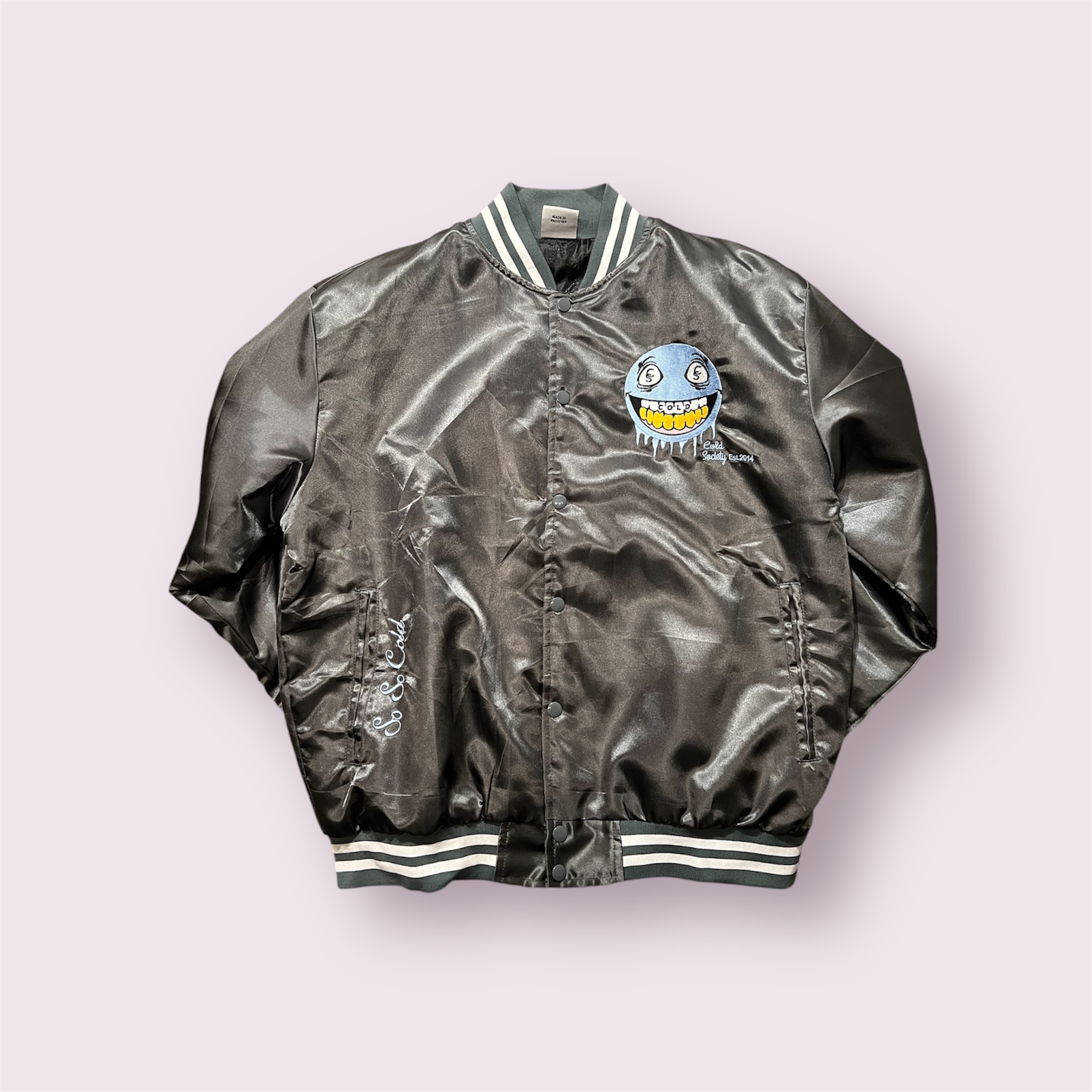 Be the first to review “Satin “Have A Cold Day” Bomber Jacket – Cool Grey”